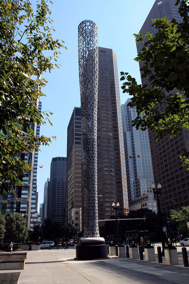 К моменту появления «Колонны-биты» в Чикаго Олденбург уже успел создать 13-метровую «Прищепку», однако настолько масштабных работ у него еще не было. 31-метровая бейсбольная бита из стальной решетки, заказ правительства США (вернее — Управления служб общего назначения), поселилась в самом центре города, мгновенно (и предсказуемо) накликав на себя беду — в день открытия люди вышли на улицы с лозунгами «Дорогая шутка» и «Снесите это!». Тем не менее скульптура осталась на месте — что-то среднее между колонной Траяна и живущими по соседству небоскребами. Сквозь «Колонну...» проглядывает солнце; так, агрессивный образ биты наполняется новыми смыслами — становится буквально прозрачной метафорой легкого и светлого города, точнее надеждой на то, что Чикаго таким однажды станет.