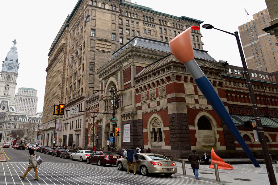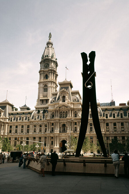Через два года после смерти жены Олденбург воздвиг в Филадельфии «Факел из краски» — стальную кисть для живописи, наклоненную под углом в 60 градусов к проезжей части. Моментально понятный образ — движение несмотря ни на что, искусство, освещающее мир. Иногда для прекрасной работы достаточно очень простой идеи.