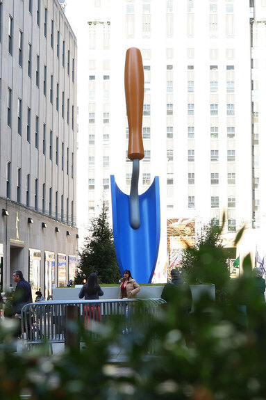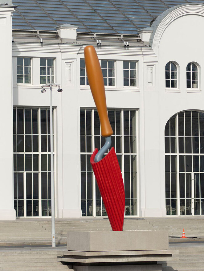 С садовой лопатки началась лавстори Олденбурга и ван Брюгген. Познакомились они еще в 1971 году, когда ван Брюгген, на тот момент куратор Городского музея в Амстердаме, работала над ретроспективой Класа. Тогда же он создал скульптуру серебряной садовой лопатки — пять лет спустя при транспортировке повредился красочный слой; в итоге Олденбург по совету своей будущей жены перекрасил объект в ярко-синий цвет, отсылающий к рабочей форме. Красная версия была создана тридцать лет спустя и впервые представлена в Метрополитен-музее. Из четырех экземпляров три курсируют с выставки на выставку от Дохи до Порту, а еще один остается у наследников скульптора. Перед «ГЭС-2» расположится та самая красная семиметровая «Лопатка», что выставлялась в Метрополитен. По выражению куратора Франческо Бонами «этот гигантский садовый инструмент передает почти наивную радость от пробуждения искусства, когда оно вдруг начинает отражать реальность и истинную природу вещей». Идеи красоты в повседневном, и так не чуждые Олденбургу, будут занимать его все нулевые годы — замечательным примером служит «Игла, нить и узел» (2000) перед железнодорожной станцией в Милане; то ли рассуждение об итальянской модной индустрии, то ли метафора поезда в тоннеле, то ли просто игла, нить и узел, красивые сами по себе, нипочему.