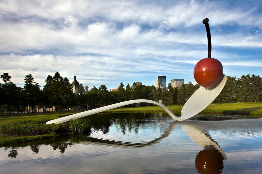 Вместо очаровательной «Ложки и вишни» в саду скульптур Миннеаполиса мог оказаться корабль викингов с носовой фигурой дракона, но Олденбург вовремя передумал. Вместо этого Клас разработал ложный мост из алюминия и нержавеющей стали в форме ложки с вишней. Тут и фирменное смешение стилей — ложка, напоминающая рекламу мороженого 1960-х, плоть от плоти поп-арта, и вишня, которая, по идее ван Брюгген, должна отсылать к изысканным ужинам в Версале, а еще самостоятельно омываться фильтрованной водой. И символ единства артистической семьи — с равноправным вкладом мужа и жены, и прикладной объект (мост), растерявший свою функциональность. Наконец корабль, обратившийся в ложку, дракон, ставший вишенкой, — «Ложка...» определенно один из шедевров Олденбурга, а некоторые даже называют ее символом штата Миннесота.