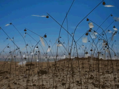 А затем Болтански делает очень простую вещь. Он берет статичную камеру и одним планом снимает эту инсталляцию из японских колокольчиков в течение светового дня — от рассвета до заката. И 12-часовой фильм, который у него получается, и составляет основу этой инсталляции. Во время экспонирования он предлагает этот фильм дополнить пустыней Атакама, которая словно вырывается из экрана — настоящей сухой травой и реальными цветами, которые видит зритель в пространстве зала. Реальное и иллюзорное сливаются в единое пространство тишины. И в этой тишине появляется звук — японские колокольчики, которые, дрожа на ветру, поют песню ветра, песню рождения и песню смерти одновременно.