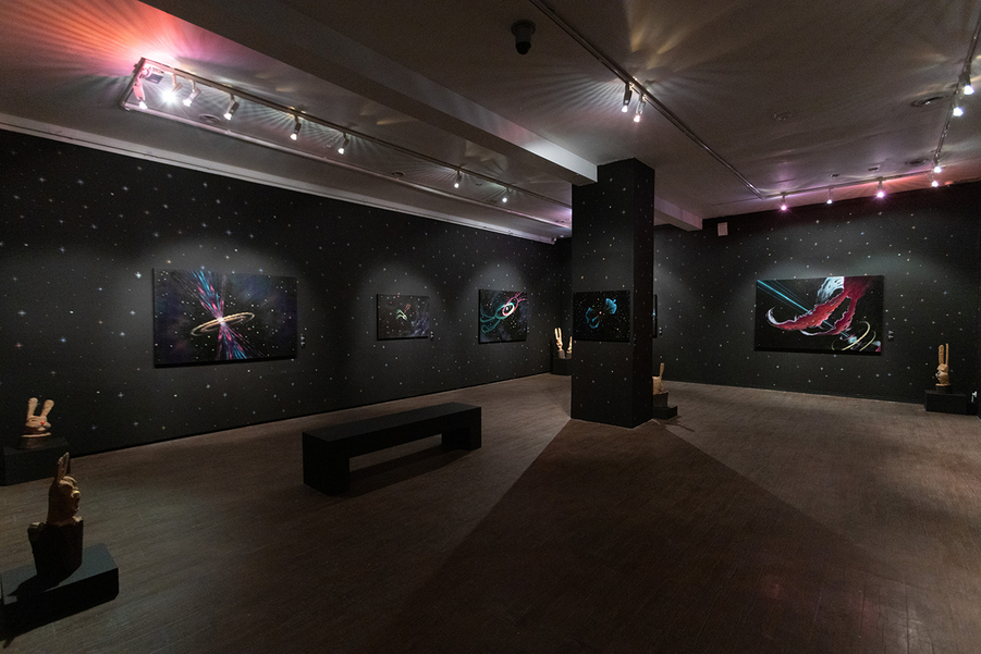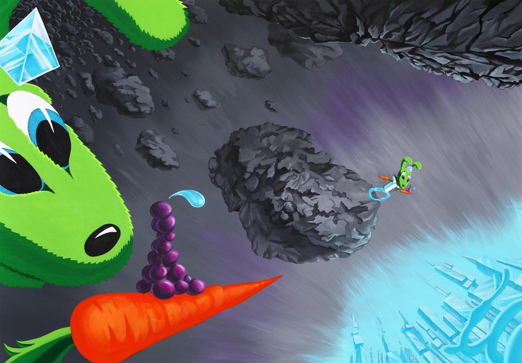 На этой выставке выяснилось, что я не то чтобы радикально поменялся и занимаюсь совсем другими вещами. Раньше я рисовал игрушками на холсте, пытаясь из его поверхности сделать модель космоса, а потом стал делать огромных зайцев в космосе. То есть получается, что, по сути дела, занимаюсь-то я одним и тем же всю свою жизнь, видимо, с раннего детства. Да, выглядит это все по-разному, но вот главное, в сущности, не меняется. Вот я и пытаюсь сформулировать, что это такое, самое важное, — но мне надо еще для этого познать самого себя. Да, то есть, наверное, я гораздо лучше смогу ответить на твой вопрос через пару месяцев.