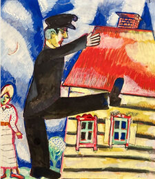 Например, вскользь упомянуто, что в 1906–1907 годах Шагал делал вывески для лавок в Санкт-Петербурге. Именно бакалейные и парикмахерские вывески наравне с жестяными подносами стали важным вдохновением для мастеров круга «Бубновый валет»: благодаря таким вывескам Ларионов, например, стал вводить текст в свои работы. Шагал пришел к этому жесту органически, непосредственно через ремесло. Неопримитивизм столичных художников резонирует с такими работами Шагала, как «Дом в местечке Лиозно» (1914) или «Парикмахерская» (1914), — видно, однако, что Шагал не пытается гипертрофировать простецкую манеру, для него это родной язык, пусть и подзабытый. Парикмахерская — важная тема для Ларионова, вспомним, например «Офицерского парикмахера» (1909), но у Шагала парикмахер не обобщенный тип, а очень конкретный родственник, что добавляет иную, личную, а не экспериментально-штудийную интонацию. Впрочем, о взаимоотношениях Шагала с российско-советскими современниками на выставке нет ни слова: скажем, деликатно опущена вся история с Казимиром Малевичем и академией в Витебске, а там ведь набирается на отдельную новеллу!