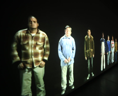 Еще один пионер видео-арта, художник с Западного побережья, увлеченный, как большинство авторов его поколения, идеями постструктуралистов, исследующих мир как текст, рассинхронизирующих звук и изображение, последовательно деконструирующих саму ткань кинематографа и пространство проекции. В своей работе Wall Piece, проходящей по категории высокотехнологичного видеоперформанса, Гарри Хилл прыгает на стену плечом, и ровно в этот момент включается яркая вспышка и художник произносит слово или его часть. В какой-то момент эти явления рассинхронизируются, но тебе удается уловить какой-то смысл в произносимом тексте, а затем и это теряется. Это видео работает с диссоциацией восприятия, разрушением комфортного режима синхронности звука и изображения, добавляя сюда неудобный момент болезненных ударов художника об стену. Работа Viewer — это пятиканальная инсталляция с синхронизатором пяти экранов, где 16 разных не белых мужчин, показанных в человеческий рост, смотрят на тебя так же, как ты на них. Это инсталляция об обмене ролями, в котором зрителем становится произведение, а ты оказываешься как бы на сцене. Ну и учитывая социальный подтекст, можно понять еще и как критику белого доминирования, где в центре рынка рабочей силы — ты, а не они.