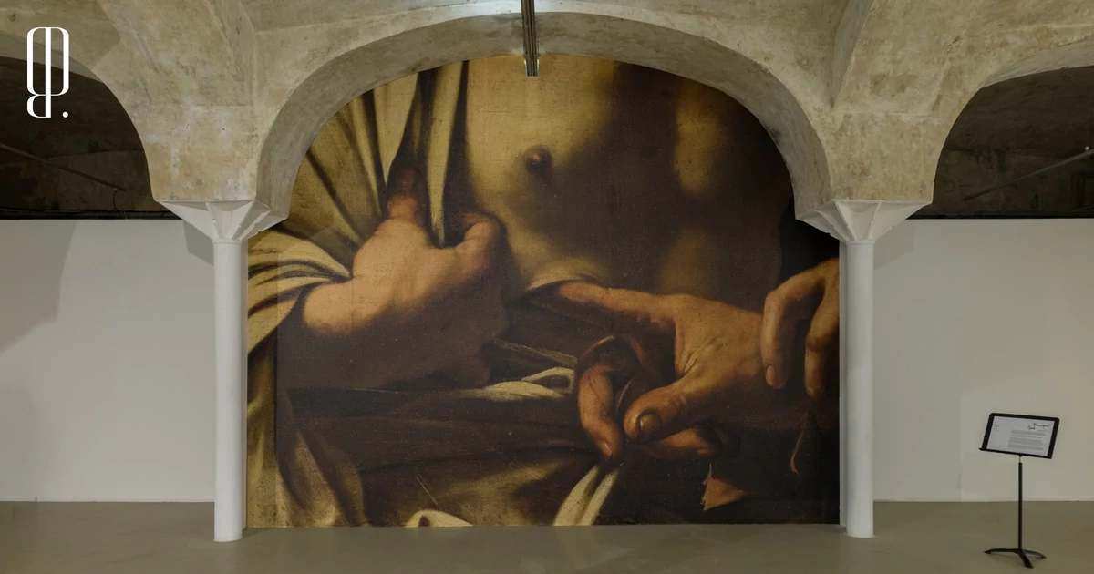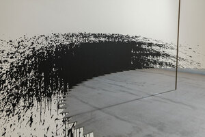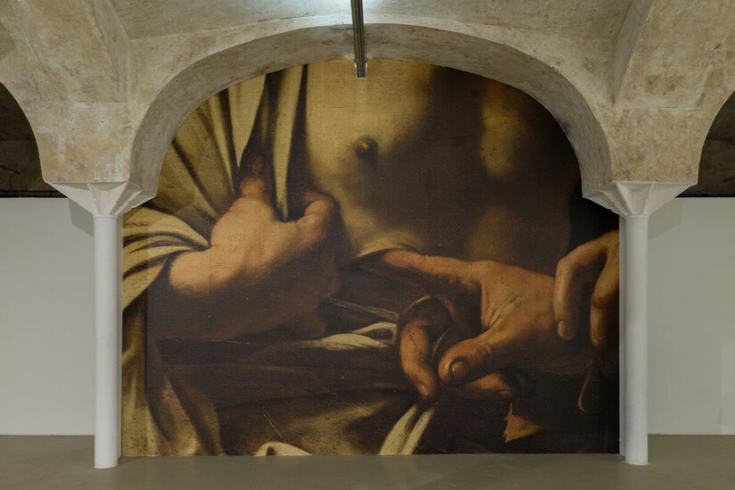 Ну а две другие работы великолепно представлены в ансамбле: речь о работах Петра Белого и Дмитрия Гутова, — вместе они представляют память ранящую и память-рану. Гутов — связующее звено между двумя выставками архивной серии: его «Стопы» были представлены в первой серии НИИ «Архив». Сейчас же он делает парафраз «Стоп» — увеличенный в масштабе фрагмент картины Караваджо «Неверие апостола Фомы». Петр Белый в своем проекте «Пауза» сочетает две фланкирующие пространство циркулярные пилы с нанесенными на стену брызгами черной краски. Пауза как стоп-кадр из триллера (видимо, триллера про абстрактный экспрессионизм). Конечно, сопоставить рану и оружие — прием спектакулярный, театральный, но недаром мы сравнили Мизиано с режиссером на кинопробах. Этот эффектный ход работает на аффект: ощущение искусства как острия жизни сочетается с той самой проблематикой неверия в чудо — «Это было со мной?!»