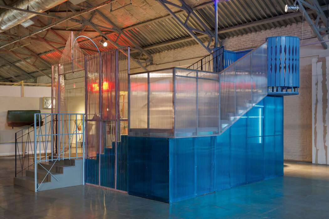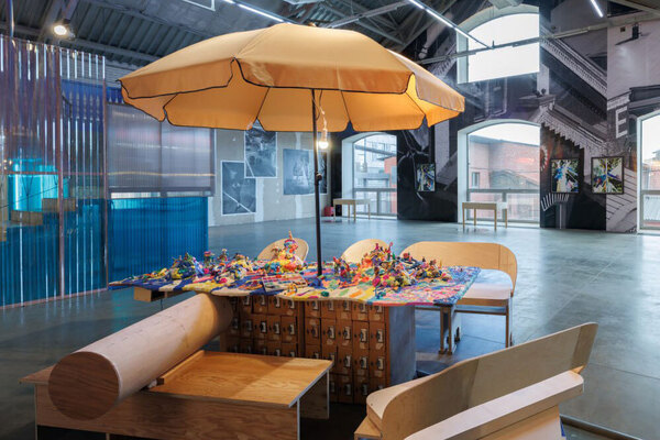 Другой важной частью проекта стал «Дежурный чудак» с недавней выставки «Не слитно, не раздельно» в «ГЭС-2». Эта работа — пластическая метафора памяти, которая похожа не на картотеку, а на странные нагромождения зыбких фрагментов, сплавленных в амальгаму. Художница создала это причудливое здание по мотивам своих впечатлений от поездки в Узбекистан: фрагменты, цвета, фактуры — художница по памяти воспроизводит детали увиденного, в субъективном восприятии реальность принимает причудливую форму. По сравнению с вариантом из «ГЭС» этот «Чудак» стал лаконичнее, прозрачнее, звонче; принцип создания здания тем не менее тот же. Переплавление, переработка, пересборка — все это относится и к памяти, и к совместной работе посетителей с пластилином.