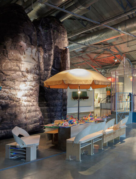 Ровно над инсталляцией Новикова, на втором этаже выставки, развернулось во всей красе другое архитектурное сооружение — «Коворкинг-зона “У черной скалы”» Ирины Кориной. Художница пересобрала несколько своих работ, сделав акцент на партиципаторной сущности своей практики: главными участниками ее работы должны стать зрители, для них она приготовила столы с пластилином. По итогу сотворчества всех посетителей должна получиться общая пластилиновая композиция. «Я думаю об этой работе как об архитектуре антрактов, о пространстве встреч и остановок. В ЦСИ “Винзавод” это особенно важно — здесь всегда есть пороги, лестницы, коридоры, где люди общаются, отдыхают, обсуждают увиденное».