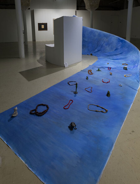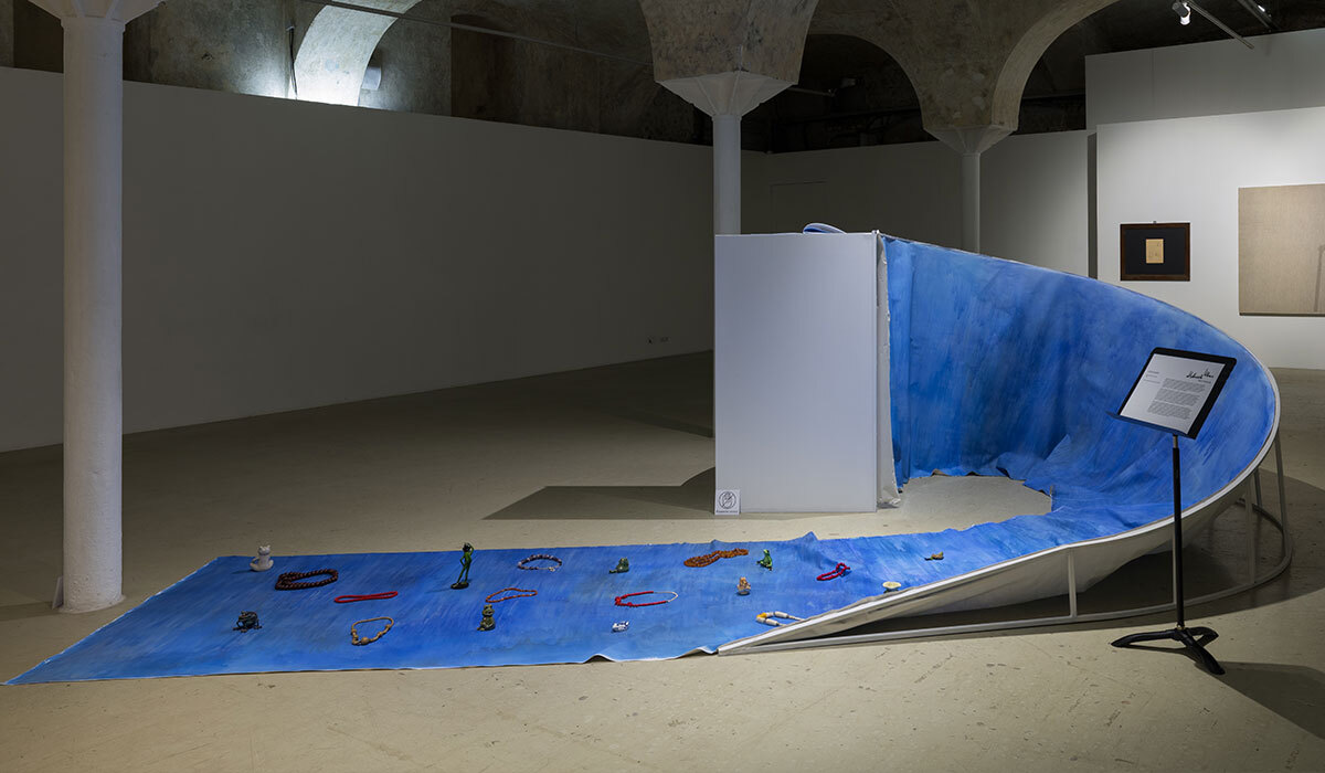 Иван Новиков — художник, в чьих проектах сложносочиненная монохромная живопись приобретает исследовательскую подоплеку и инсталляционное воплощение, как на недавней выставке «Синий» в pop/off/art, где живопись экспонировалась на подставках для экранов. В последние годы Иван занимается «синей серией»: аскет-формалист поставил себе задачу создавать исключительно синие работы. Слово blue в одном из значений ассоциируется с грустью, меланхолией и тоской по ушедшему — именно эту ипостась выбранного цвета Новиков раскрывает на «Винзаводе» в инсталляции Locus Sacer. Квазиархитектурное сооружение, напоминающее одновременно церковную кафедру, ледяную горку и детские постройки из мебели, — мемориал, который художник выстроил своим родителям. На длинном, закрученном спиралью листе синего цвета, как на живописной мантии, разложены бусы и фигурки лягушек — то, что коллекционировали родители Ивана.