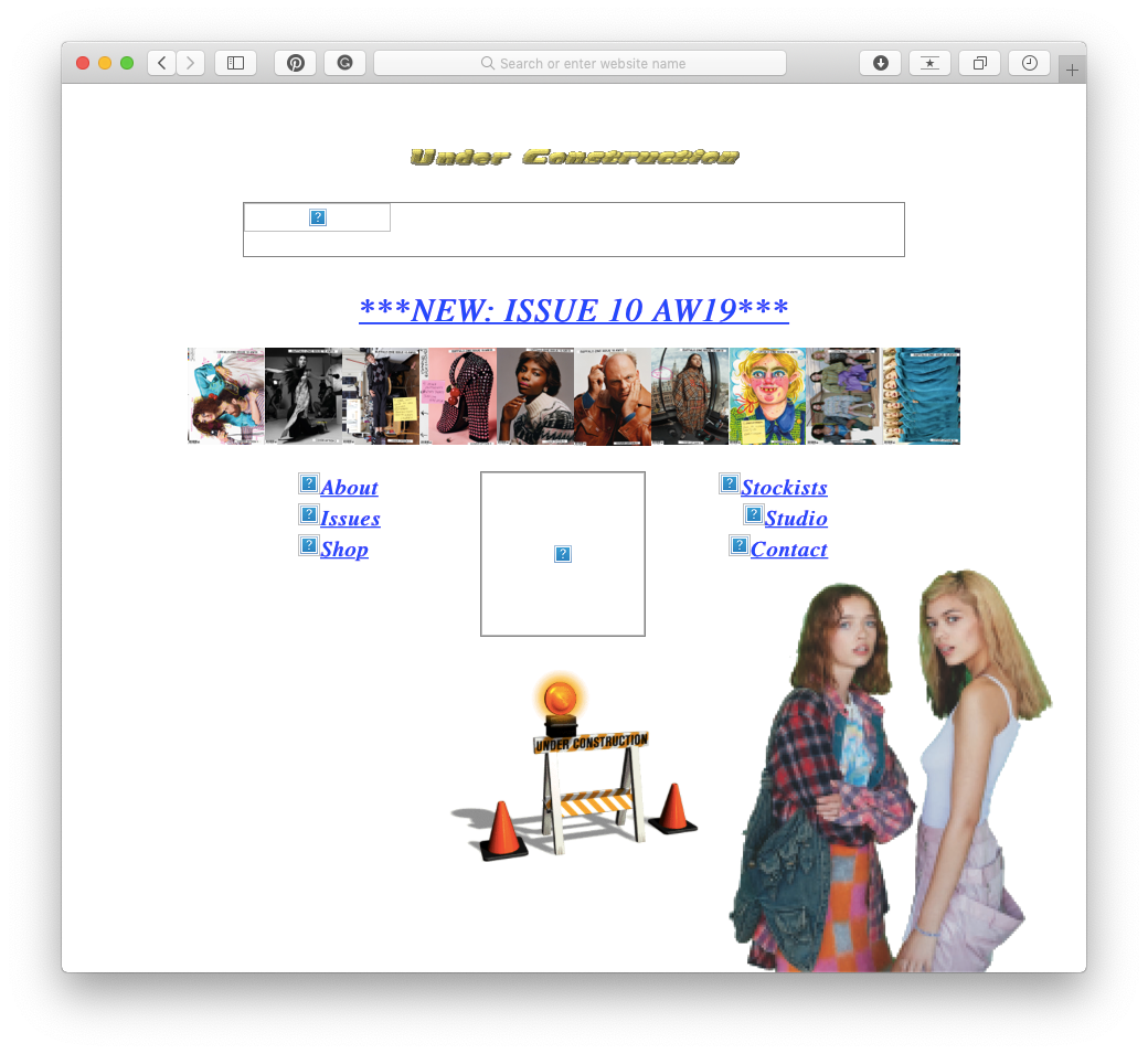 На время продаж нового номера изменился даже дизайн сайта Buffalo Zine — теперь он выглядит так, будто страница не загрузилась до конца. С помощью этой намеренной неряшливости Эдриан и Дэвид пытаются сбить спесь с глянцевых журналов, которые все еще стремятся к недостижимому идеалу: «Это Buffalo Zine без штанов. Добро пожаловать в волшебный мир глянца!»