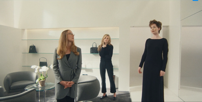 Как эта любовь к минимализму утвердилась, нам как раз показывают в первых эпизодах, где Кэролин только начинает свою карьеру в моде, — ни дать ни взять «Дьявол носит Prada-2», причем вполне хороший. Свой рабочий день Бессетт начинает с того, что выхватывает из кучи одежды более-менее чистые джинсы, надевает черный свитер, покупает в киоске пачку сигарет, журнал Vogue и заходит в офис Calvin Klein, оформленный в стиле «Американского психопата» (по признанию продакшн-дизайнера, это один из ключевых референсов): панорамные окна, высокие потолки, белые стены.
