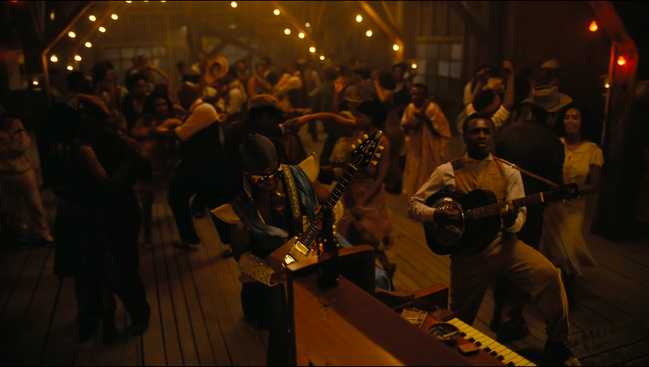Вот история, как члены ку-клукс-клана обвинили черного мужчину в вымышленном убийстве, чтобы ограбить. Вот тяжелая работа на плантации — уже не в рабстве, но все еще за копейки. Вот отвратительный — пыхтящий, тучный, с сальным видом и едва не значками долларов в глазах — владелец старого амбара, который братья арендуют, чтобы открыть juke joint: пространство черной музыки и черной свободы.