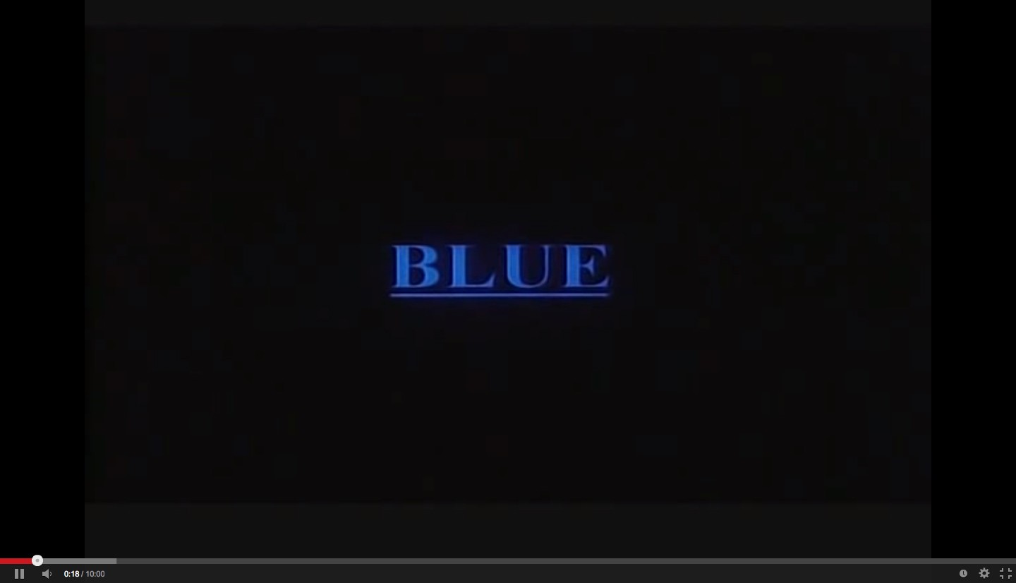 Blue — последняя работа почти ослепшего от СПИДа Дерека Джармена, один из самых искренних фильмов за всю историю кинематографа, своей минималистичной формой противоречит любому представлению о киноязыке. Статичный прямоугольник синего цвета присутствует на экране все 70 минут, которые длится фильм, и сопровождается преисполненной вселенской печали и неизбывной тоски исповедью режиссера. В компании любимых актеров Джармен вспоминает всю свою жизнь, но кажется, что все действие заключено не в звуке и словах, а в бездонности именно синего экрана, каким-то образом вместившего в себя всю боль и душевный надлом режиссера. Синий цвет, символизирующий у многих народов вечность, у Джармена принимает форму окна в личную память отдельно взятого человека, подводящего итоги своей жизни и уже на полшага ступившего в вечность.
