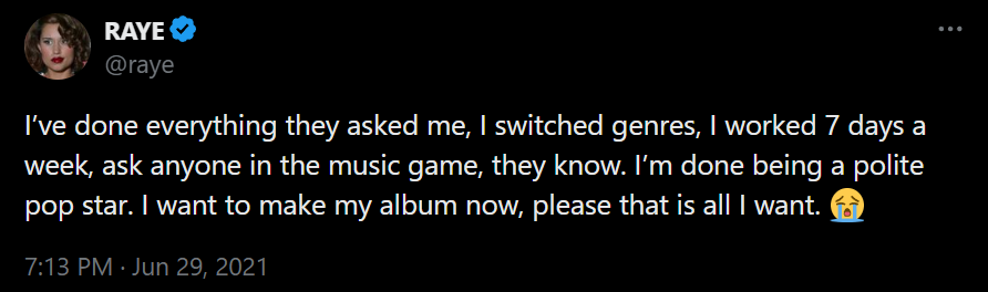 К тому моменту она уже могла так заявить, потому что была свободной артисткой — в июне 2021-го Polydor разорвали контракт с Raye, после того как она выложила несколько эмоциональных постов в соцсети. «Я больше не хочу быть вежливой поп-звездой. Я хочу выпустить свой альбом, пожалуйста, это все, чего я хочу», — написала она в X.