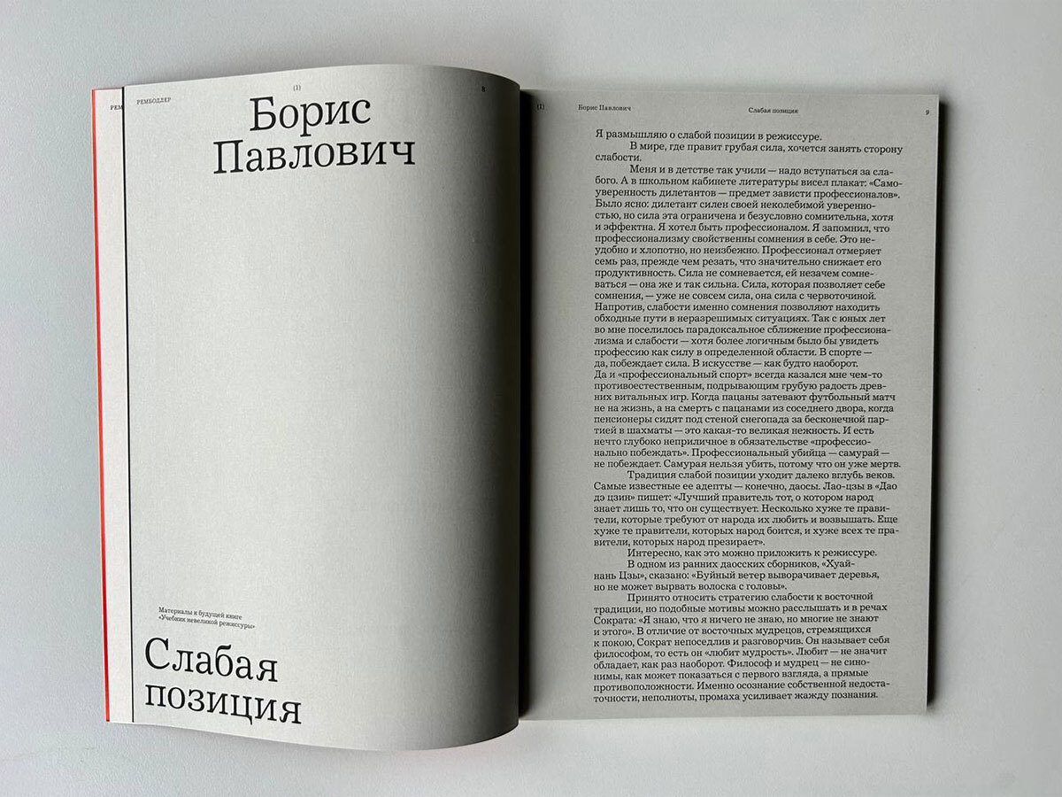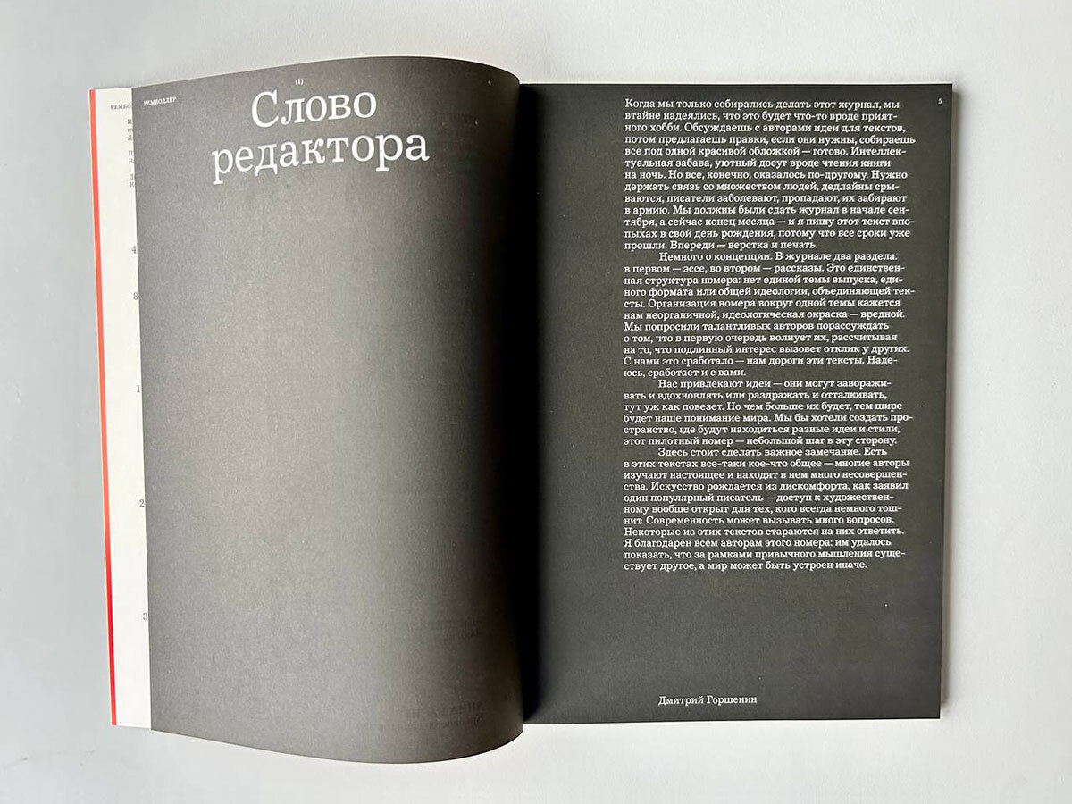 — объясняет главный редактор «Рембодлера» Дмитрий Горшенин. Журнал, выросший из одноименного телеграм-канала Горшенина (Дмитрий, бывший журналист и владелец кофейни с набоковским названием «Пнин», несколько раз был в составе блогерского жюри премии «Лицей»), запустился в октябре этого года. Помимо него в журнале работают супруга Дмитрия, шеф-редактор Валерия Горшенина, а также дизайнер Кирилл Горбунов и корректор Наталья Шевченко; тираж первого номера — 500 экземпляров. В подписных изданиях «Рембодлер» стоит 1140 рублей. По словам основателя, этот журнал — «что-то вроде перформативного высказывания. Он существует не для того, чтобы вдохновлять, а для того, чтобы быть».