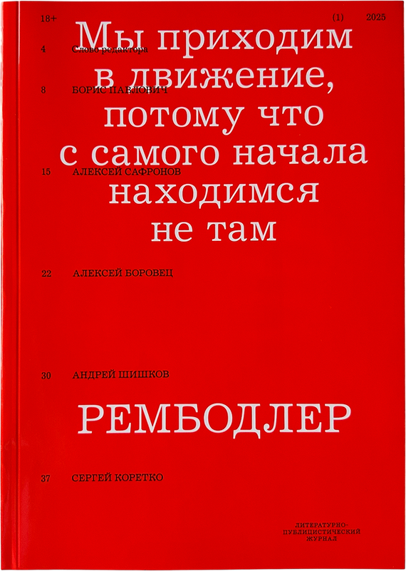 Растерянность, а то и беспомощность перед стремительно меняющимся миром — лейтмотив «Рембодлера», как и стихотворений двух французских поэтов, подаривших журналу название: Артюра Рембо и Шарля Бодлера. Вместе с художественными текстами Аси Демишкевич, Анны Баснер, Дениса Дымченко культурологические эссе (например философа Сергея Коретко об альтернативных реальностях) приглашают читателя к не слишком веселому, но осмысленному и занимательному разговору, который начинается с цитаты Бориса Павловича «Мы приходим в движение, потому что с самого начала находимся не там».