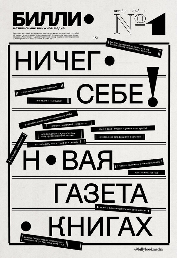 «Ничего себе! Новая газета о книгах» — именно такой кричащий заголовок видит читатель на первой полосе. Дебютный выпуск газеты наполнен материалами: от символических итогов книжного года до погружения в писательские резиденции и особенности удмуртской литературы. По словам Мамлыги, самое важное в проекте — это «поиск неочевидного читательского опыта». Соответственно Максим определяет и средних читателей «Билли» — это люди, которые уже любят читать и «стремятся понять, как устроен мир вокруг книг». Максим всегда держит руку на пульсе. Когда благодаря книжным магазинам в Назрани и Грозном в рейтинг бестселлеров попал роман-эпопея Идриса Базоркина 1967 года «Из тьмы веков», Егана Джаббарова написала для «Билли» на него рецензию (а затем взяла из романа эпиграф к своей книге Terra Nullis). «Все кинулись издавать книги о мифах и сказках, — продолжает Мамлыга, — поэтому для рубрики “Библиография” мы обращаемся к фольклористке Надежде Рычковой». И так далее в том же духе — нью-эдалт сменил янг-эдалт, и об этом пишет Ольга Птицева. Вокруг появляются независимые книжные проекты, которые не получают достаточного освещения, — «Билли» рассказывает об автофикшн-вечеринке в Нижнем Новгороде и белградском издательстве и сообществе shell(f)...