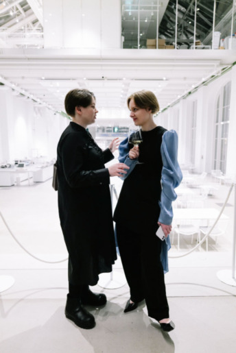Вообще-то план был такой: собрать за одним столом людей из разных сфер, сыграть в карточную игру от организаторов секретных ужинов Stay Hungry («На каком фильме вы в последний раз заснули?», «Где самый вкусный буфет?», «Бейонсе или Леди Гага?») — и всех друг с другом перезнакомить. На деле же многие гости справились с задачей и без карточек с вопросами. Худрук балета МАМТ Максим Севагин увлеченно беседовал с писательницей Асей Володиной, дизайнер muus Лена Максимова — с хореографом Александром Могилевым, соосновательница USHATÁVA Нино Шаматава — с директором ярмарки современного искусства Cosmoscow Маргаритой Пушкиной, которая планировала заглянуть «на чуть-чуть», а в итоге покинула «ГЭС-2» уже после закрытия.