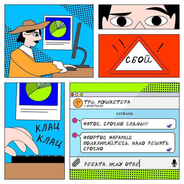 — Смотрите! — его палец упирается в экран, где мигает едва заметная аномалия. — Необычный всплеск трафика в одном из центральных районов. Пока не критично, но надо бы продиагностировать! Коллеги реагируют сдержанно. Сбой — точечный. По регламенту полагается собрать статистику за сутки, оформить заявку, отправить ее в отдел эксплуатации и ждать своей очереди. Такой ответ Дартаньянова не устраивает. Тут же он пишет в общий чат. Атосов из эксплуатации отвечает: «Вне плана работ. Есть приоритетные задачи». Портосов из колл-центра реагирует более эмпатично: «Бро, пока клиенты не звонят. Давай еще подождем?». Аналитик Арамисов углубился в стратегические планы развития сетей — ему пока не до внезапных вопросов.
