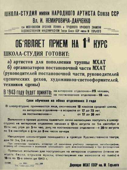 Через месяц, 25 апреля 1943-го, 84-летнего режиссера не стало. 26 апреля Совнарком опубликовал программу по сохранению его наследия. Первым пунктом шел указ о создании Школы-студии имени В.И. Немировича-Данченко при МХАТе имени Горького. Ректором стал режиссер МХАТа Василий Сахновский, а официальной датой открытия Школы считается 20 октября 1943 года, когда начались занятия у первого актерского курса.