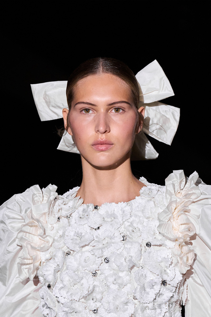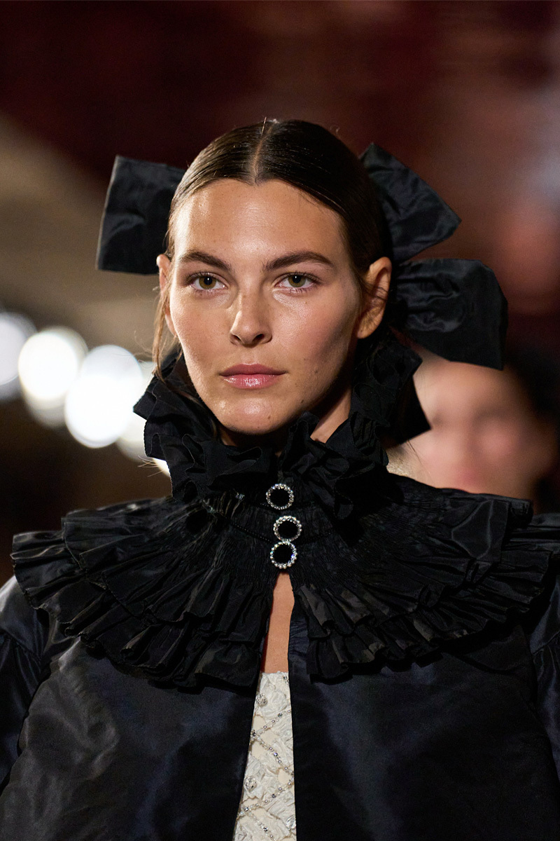 В фильме нет не только глубокого погружения, но и практически нет самого кутюра. Офис и ателье Chanel, узнаваемые по культовой зеркальной лестнице, мелькали лишь в паре сцен знакомства Максин с командой бренда. Как и наряды: не оригиналы, а точные (или почти точные) копии примерно десятка образов — платьев из органзы и тюля приглушенных оттенков, от жемчужного до пудрового, с характерными рюшами, камелиями и пуговицами (и все еще без фирменных логотипов). Для их создания модный дом открыл двери в архивы художнице по костюмам Паскалин Шаванн — обладательнице двух «Сезаров», относительно недавно работавшей, например, над сериалом «Стать Карлом Лагерфельдом». Впрочем, разглядеть кропотливый труд костюмеров, клонировавших Chanel, зритель может попытаться разве что ближе к концу фильма — в сцене с показом, золотой бижутерией и черными бантами на головах моделей (но не платьями или декорациями) напоминающим кутюрное шоу бренда сезона осень—зима 2024/2025, прошедшее в июне 2024-го, почти за полгода до старта съемок фильма.