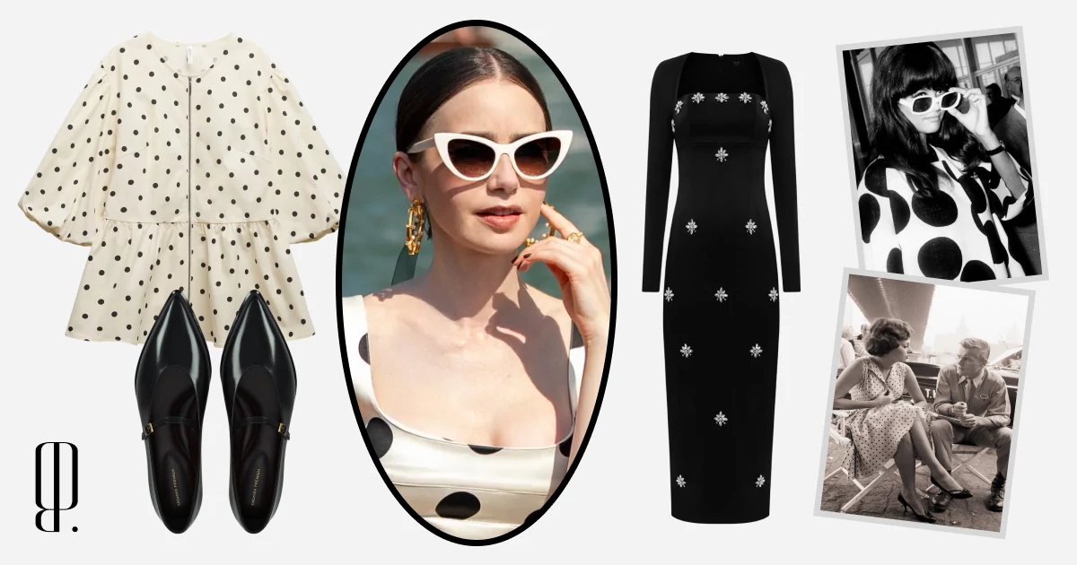 В пятом сезоне Эмили носит вещи с гороховым принтом едва ли не в каждой серии, но ключевым образом — и главным оммажем итальянскому кинематографу — становится ее наряд в финальном эпизоде, когда она приезжает в Венецию на дебютный модный показ своего возлюбленного. Иронично, но в отличие от большинства других костюмов Лили Коллинз, сшитых итальянскими брендами (Dolce & Gabbana, Moschino, Fendi), этот комплект из юбки и топа был создан датским брендом Stine Goya — специально по заказу Фитусси.