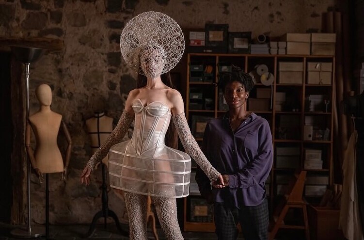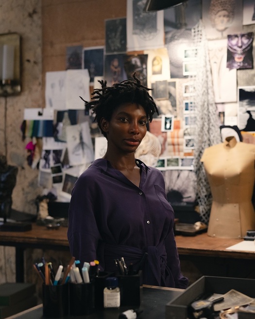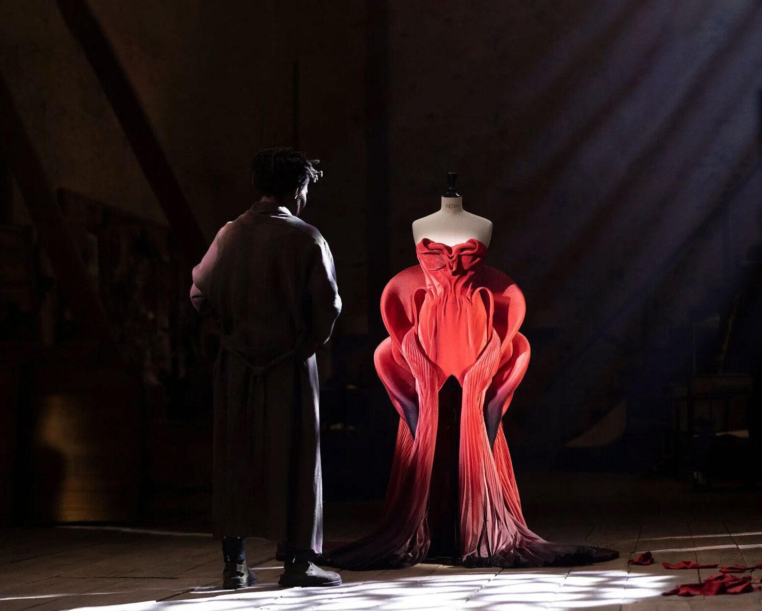 А вот для работы над главным платьем — тем самым, за которым героиня летала в Лондон, — Бина с Лоури призвали Ирис ван Херпен. «Дэвид просто очарован ее карьерой, всем, чего она достигла. Мы навестили ее в Амстердаме — она подготовила для нас несколько разных идей», — вспоминала Дайгелер. В итоге нидерландский дизайнер реализовала одну: платье с объемными волнами на бедрах, талии и спине — из плиссированной органзы, окрашенной градиентом от красного сверху к черному снизу. «Мы на самом деле хотели уйти от ожидаемого сценического образа поп-звезды», — сказала Ирис, подчеркнув, что платье напоминает некого духа: «Красный — это духовный цвет. А также цвет внутренней части тела — плоти и крови». Разница между реальным процессом созданием платья и тем, что мы видим на экране? «Мисс ван Херпен потратила на него три месяца, а Сэм — одну ночь», — докладывает The New York Times.