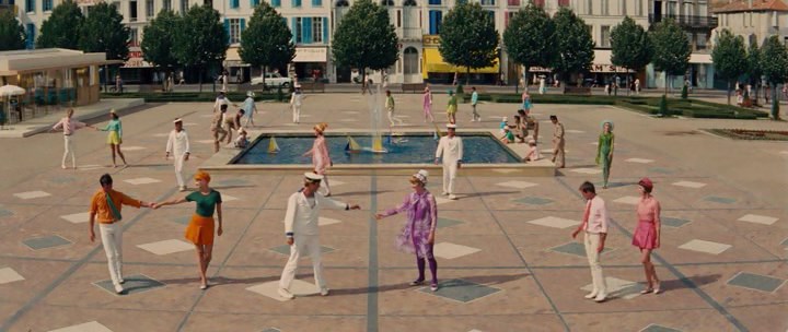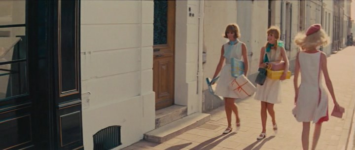 Так, главными цветами становятся пастельно-розовый и голубой. На первый взгляд кажется, что это симметричное образное разделение на мужское и женское, но никакого сексизма — и герои, и героини прекрасно комбинируют оба цвета в своих костюмах, иногда добавляя фиолетовые или оранжевые детали. Блондинка Дельфин меняет розовые платья-трапеции и белые колготки на пятнистый полупрозрачный халат с голубыми рюшами. Соланж надевает то сиреневое, то розовое, то ярко-оранжевое — неизменными остаются лишь длина мини и лазурные тени на веках. Американец Рэми отбивает чечетку в розовом поло, а затем, переодевшись в рубашку того же цвета и сиреневый пиджак, играет на рояле концерт своей возлюбленной. Все это торжество цвета дополняется торжеством аксессуаров — замысловатыми oversize-шляпами, тонкими галстуками под цвет рубашки, перчатками разной длины и огромными клатчами.