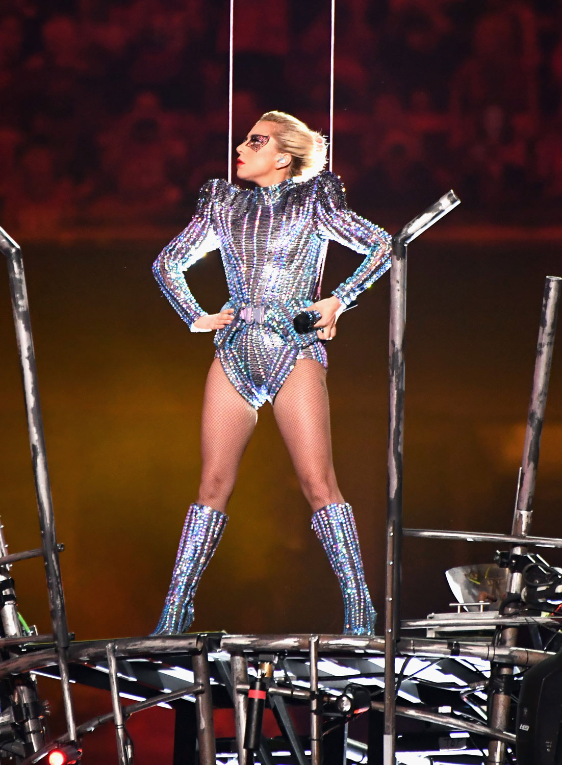 Гипертрофированные плечи, тонны кристаллов и колготки в крупную сетку — о любви Гаги к эстетике 1980-х мы знаем еще из ее клипа Poker Face. Судя по ее выступлению на Суперкубке, все осталось по-прежнему. Всего вчера вечером между таймами Гага успела сменить три наряда — все от Atelier Versace и усыпаны килограммами стразов Swarovski. На сцену Гага эффектно спустилась на трапеции с крыши стадиона — в космическом боди, напоминающем о Дэвиде Боуи периода Aladdin Sane, сверкающем макияже и сапогах в тон. Дальше — больше. Перед композицией Just Dance Гага на и без того впечатляющие фигурные плечи натянула золотой жакет (тоже весь в стразах). Финальный образ — белые шорты и кроп-топ, в которых силуэт Гаги стал максимально напоминать об американских футболистах. К слову, большей частью треки, выбранные для выступления, были записаны до 2010 года. И в целом сценические наряды оставляют такое же ностальгическое впечатление.