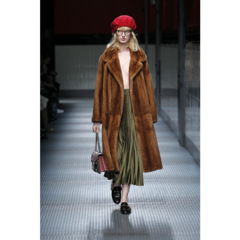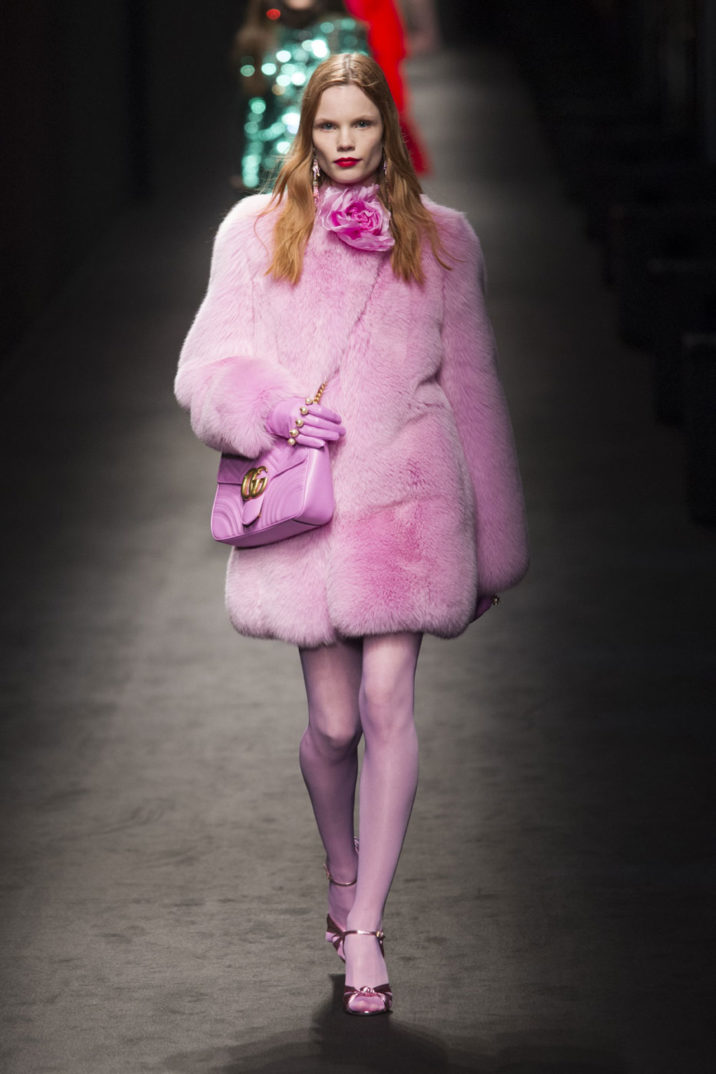 Образ с розовыми колготками и розовой же шубой из лисы, в котором Полина Оганичева вышла на осенне-зимнем показе Gucci, оказался одним из самых цитируемых в модной прессе. И Фрида Джаннини, и Том Форд натуральный мех очень любили, но именно Алессандро Микеле хватило духу обращаться с ним по-хорошему неуважительно. Результат — шубы вернулись в моду во многом благодаря ему.