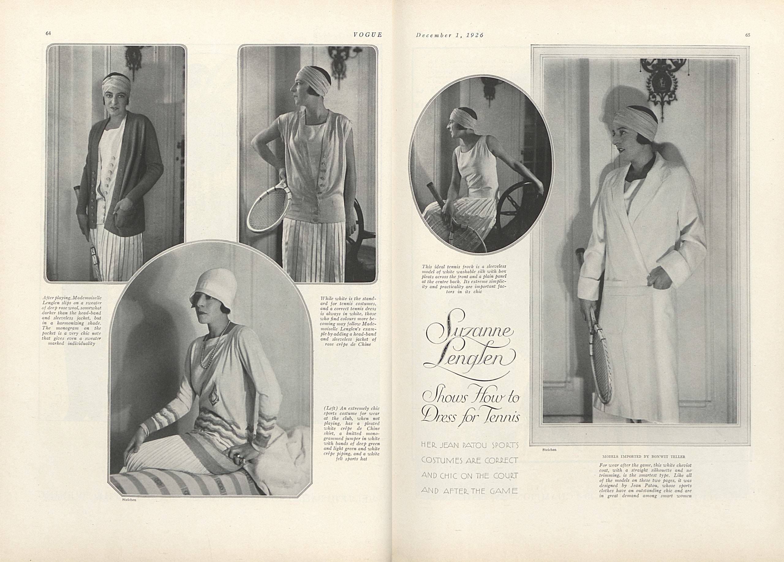 20-е считаются первой эпохой, когда спорт попадает в зону интересов больших дизайнеров из мира высокой моды. Один из пионеров этого движения Жан Пату открывает в своем модном доме отдел спортивной одежды, выпускает тематические духи и одевает теннисистку Сюзанн Ленглен. Ее же в 1926 году в роли модели снимает для Vogue Эдвард Штайхен. Ни один модный журнал или каталог 20-х не обходится без обширного раздела одежды для спорта и активного отдыха.