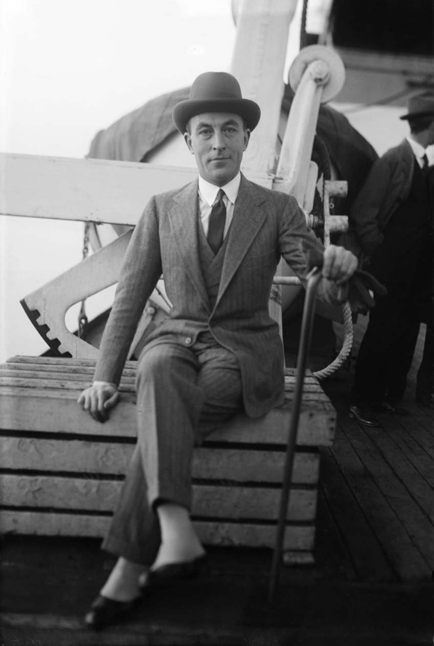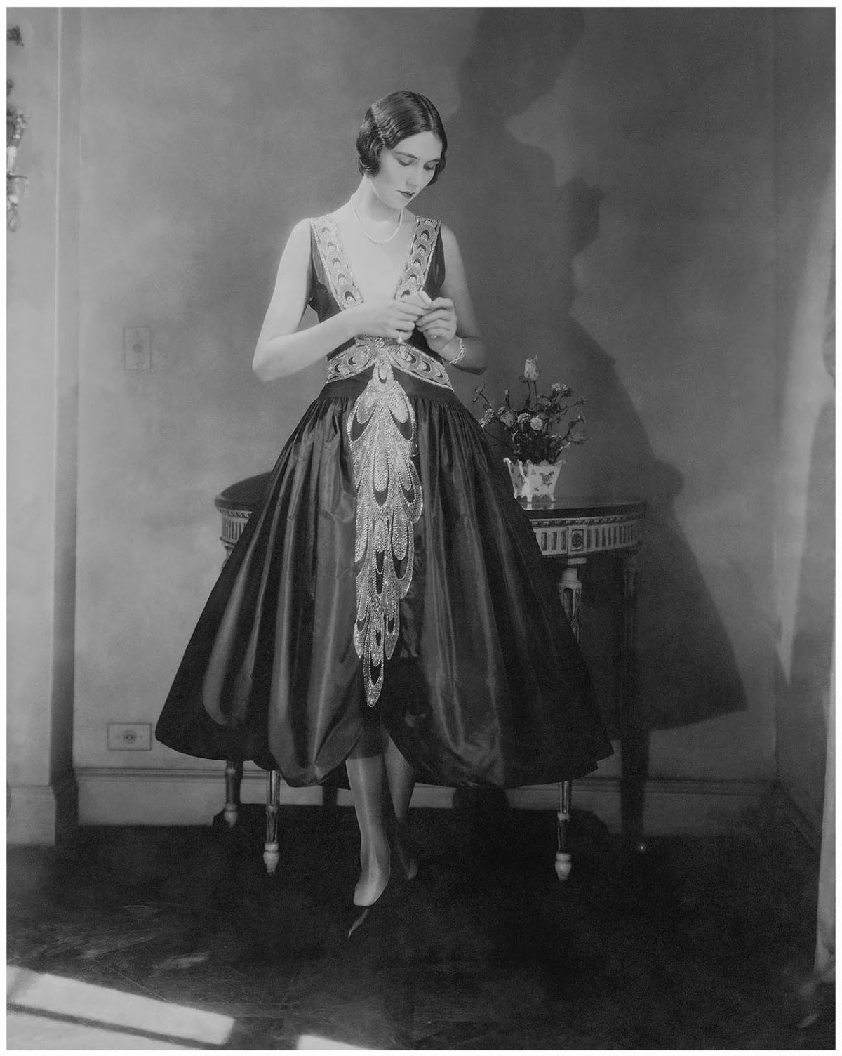 Пиджак с вышивкой и глубоким V-образным вырезом, плиссированная юбка, широкополая шляпа и жемчужная нить в образе Lanvin, фото: Сибергер Феререс, 1923