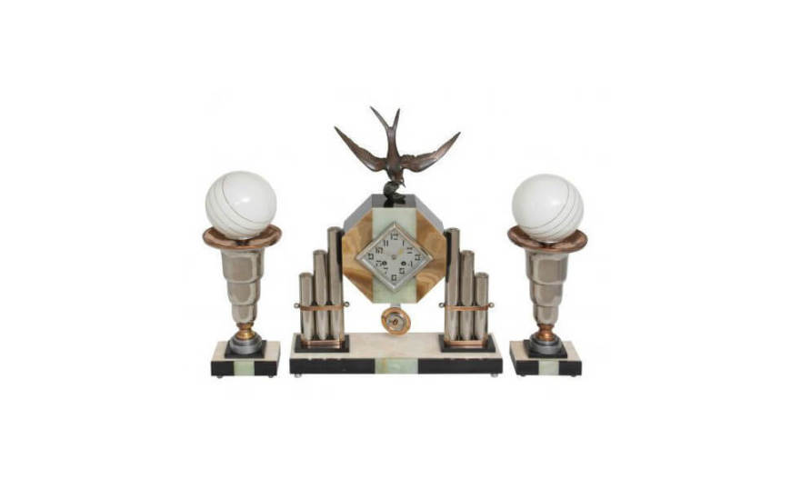 Часы с бронзовой ласточкой и двумя лампами в виде глобусов, Франция, ок. 1930