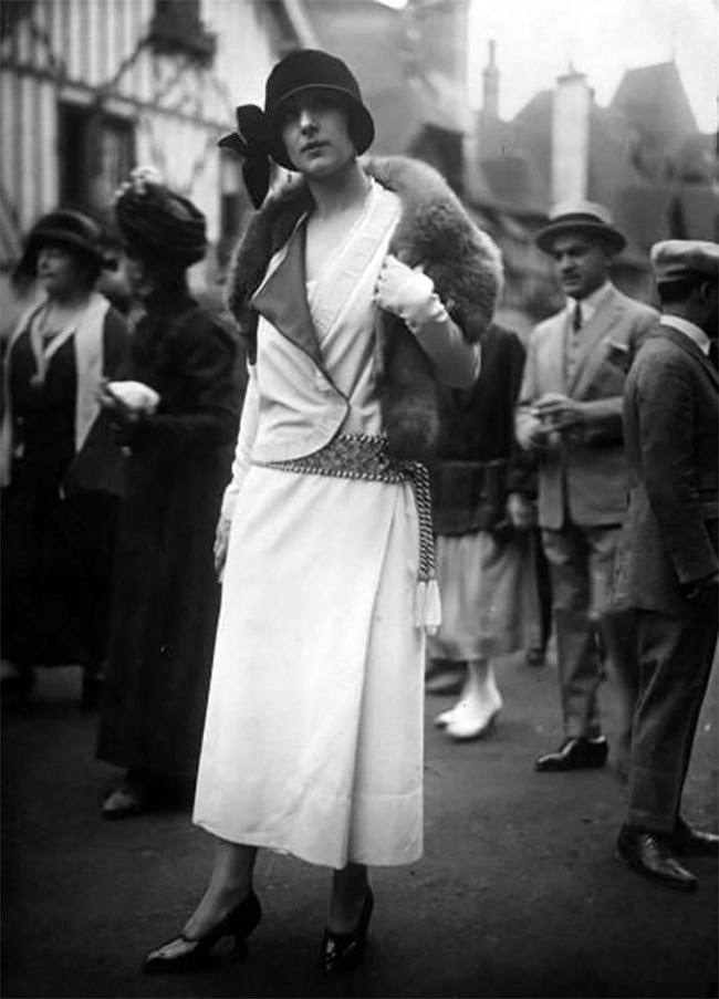 Стереотипный силуэт ар-деко 20-х — прямое, довольно короткое платье длиной до колен или чуть выше с заниженной талией, которое не подчеркивает талию и бедра. Обычно так выглядят стандартные «платья в стиле Гэтсби», активно тиражируемые в наши дни. Историческая реальность была интереснее наших нынешних представлений о ней. Даже внутри 20-х силуэт и модная длина менялись. Например, начало 20-х — это длина чуть ниже щиколотки и более объемные вещи, как бы присобранные на талии (вверх подол поползет чуть позже).