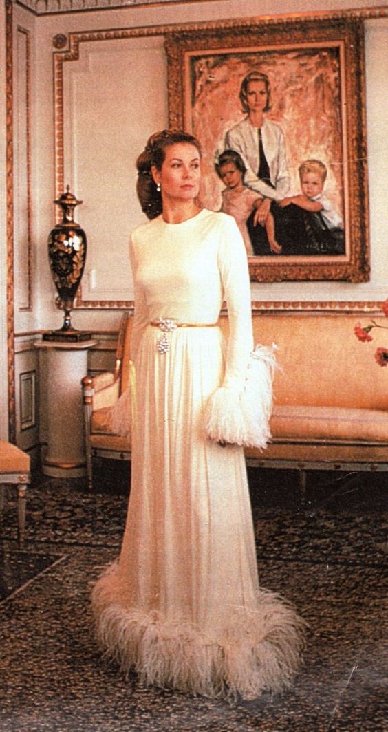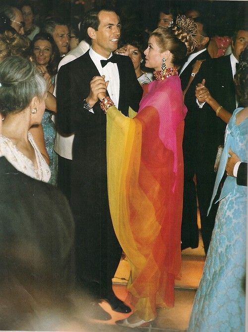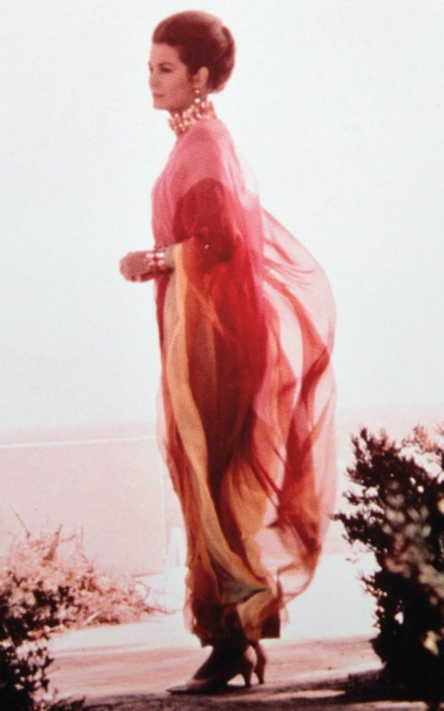 Это яркое полупрозрачное платье, которое несколько контрастировало с прочими вещами из элегантного и относительно консервативного гардероба Грейс, княгиня впервые надела, приехав в 1970 году с мужем на Каннский кинофестиваль. Но она была не из тех, кто избавляется от наряда, однажды засветив его на публике. В 1972 году Келли снова его надела — на этот раз для фотосессии Vogue. «Княгиня была очень сентиментальна во всем, что касалось одежды, — говорит Дженни Листер, куратор — Некоторые наряды были для нее как близкие друзья, она не расставалась с ними долгие годы, надевала снова и снова. Для женщины, которую всегда рассматривали как под микроскопом, это было смелым решением».