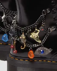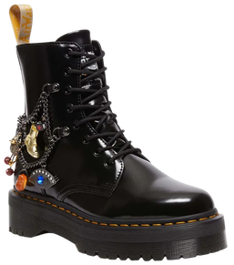 10-летний юбилей культовой пары Kiki Марк Джейкобс, по сути, отметил коллаборацией Marc Jacobs х Dr. Martens — выпустив сапоги черного и лавандового цвета на характерных для некоторых мартинсов подошвах Corran. И если черные украшены узнаваемой оранжевой строчкой, то лавандовые — подвесками в форме замка и ключа. Так, случилось своеобразное алаверды: ведь в 2018-м за основу самой первой коллаборации Marc Jacobs х Dr. Martens были взяты модели Dr. Martens 1490 и Jadon — дизайнер украсил их опять-таки замками и ключами, а еще цепями и самыми разными брелоками.