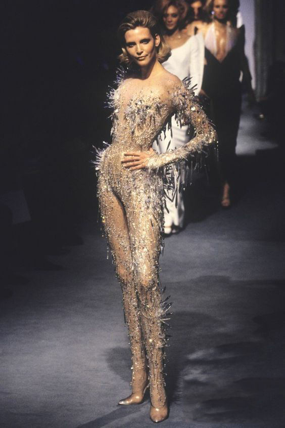 Самым ярким моментом шоу был финал — показ закрыла муза Мюглера Ева Херцигова в сверкающем, будто расшитом серебряными шипами комбинезоне. Много лет спустя, уже оставив работу в своей модном доме, Тьерри Мюглер будет создавать концертные наряды для Бейонсе в похожей стилистике.