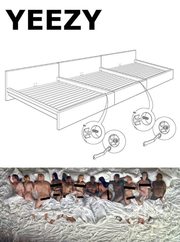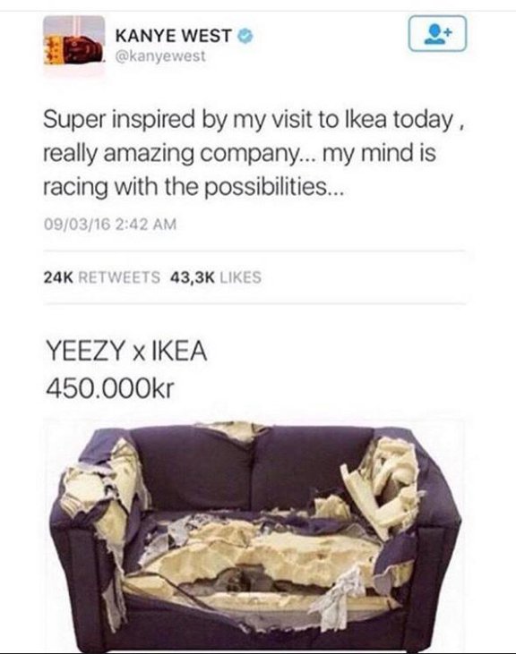 Ход получился резонансным: за выходом капсулы последовало интервью Канье Уэста для радио ВВС. Рэпер и создатель кроссовок Yeezy прямо заявил, что тоже мечтает сотрудничать с IKEA. До этого он уже намекал на возможную совместную работу в своем твитерре. Именно в этот момент проявился важный талант сотрудников шведского концерна, который впоследствии и помог марке превратиться из мебельного бренда еще и в модный. Представители австралийского отделения IKEA сумели вовремя поймать инфоповод и опубликовали у себя в соцсетях ответ: «Эй, Канье, давай-ка посмотрим, что бы ты мог для нас смастерить! Мы можем сделать тебя знаменитым!» Под этим повесили чертеж воображаемой кровати Yeezy, к краям которой можно крепить дополнительные части, делая ее бесконечно широкой. Намекали они, очевидно, на клип Канье Famous, где рэпер снят лежащим на гигантской кровати в окружении восковых фигур звезд шоу-бизнеса. Мем стал вирусным и породил целую лавину похожих. Чего только стоит стул Kardash с расширенным вдвое сиденьем или зеркало с прикрепленным на середине стикером в виде лица рэпера — отдельной строкой поясняется, что отклеить стикер нельзя. Для несуществующей коллаборации анонимным автором даже был разработан логотип в фирменных сине-желтых цветах — IKEANYE.