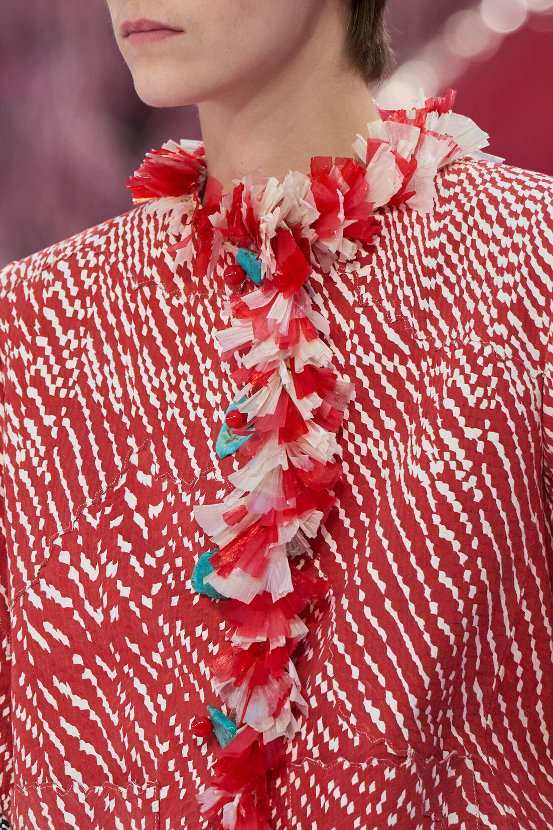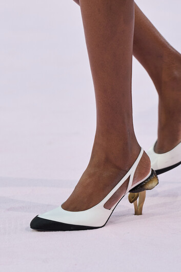 Этот будуарный шелк мы видим и дальше — ему посвящена добрая треть коллекции. Вот нежно-розовый топ и белоснежная трехступенчатая юбка — со шлейфами, разлетающимися при ходьбе. Вот расшитый грибным ассорти «пижамный» дуэт из топа нараспашку и брюк, а вот удлиненный, как ночнушка, топ в алых мухоморах. Персиковый жакет-халат с перламутровыми пуговицами и черное миди, опять же со шлейфом; оно могло бы сгодиться для скромного вечернего выхода, если бы не просвечивало так нарочито. Здесь же будто исчезающий образ серого твидового костюма и джинсов — воздушные, они даже не пытаются прикрыть шелковое белье на моделях. Самым дерзким кажется кислотно-зеленое бра с ярко-красной окантовкой — в цвет мысков новой версии двухцветных туфель; Блази наконец предлагает альтернативу бессменному черному. Самым эффектным в «будуарной» части кажется платье с воротником поло и накидкой из тысячи поблескивающих «лепестков», похожих на стекающие после душа капли. Из них же выполнен завершающий «свадебный» образ: топ-рубашка и юбка чуть ниже колена, дополненные не то острыми лепестками белых астр, не то перьями — в прическе. И никаких платьев-тортов.