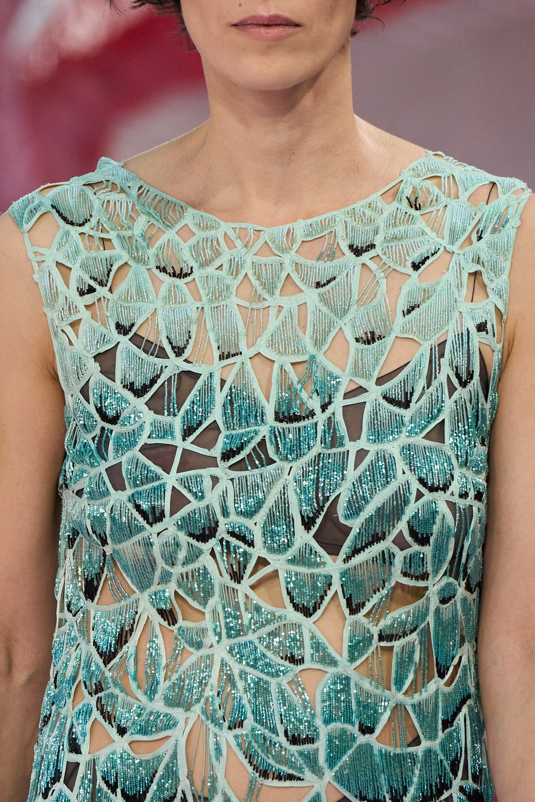 Все самое сложное в исполнении, конечно, требует пояснительных записок из ателье: как долго, как трудно, сколько бисеринок и пайеток было задействовано и почему их скрепляли именно вися вверх ногами, — такие детали всегда самые интригующие. Но и чисто визуально эти вещи, больше напоминающие флору и фауну выросшего на подиуме сказочного леса, впечатляют. Взять хоть напоминающий полураскрытый бутон топ из розовых драпировок или бирюзовое платье из выложенных бисером чешуек с эффектом деграде. Удивительны многоцветные накидки, натурально перерастающие в крылья, или бархатные топы с брюками, словно подернутые инеем. Платье на бретелях из цветных, танцующих при ходьбе петель, которые складываются в причудливый природный узор, или платье в пол из тысячи бежевых щетинок и пластинок с цветными — зелеными, красными, сизыми и черными — окантовками. Сколь громоздким это может показаться в виде текста, столь же легко это выглядело на подиуме. Коллекцию, разумеется, нужно смотреть в движении — так вещи оживают, некоторые будто парят.