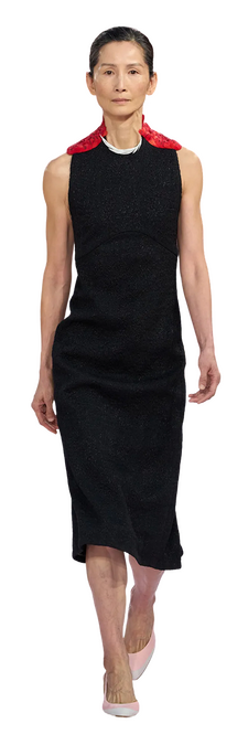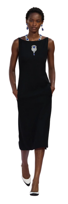 Классические маленькие черные платья и костюмы из твида, которые начинают появляться на подиуме дальше и тоже могли показаться кому-то безынтересными, — при внимательном рассмотрении оказываются с причудинкой, будто действие мухоморов Матье на них только начинает распространяться. На груди платья миди с цельнокроенными бретелями неожиданно сияют сапфиры и бриллианты — а ведь сапфировое колье на шее модели, и мы это видим совершенно отчетливо, уходит ПОД платье. На плечах другого черного миди — фактурного, кажется, из букле — покоятся, будто погоны, два алых пера.