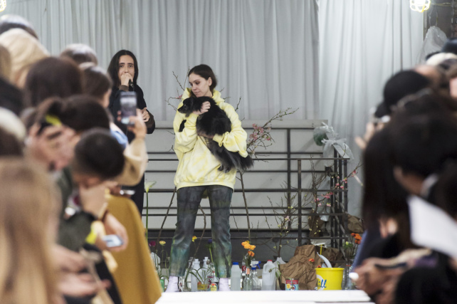 Довершало картину необычное оформление подиума: тут и там на нем лежал мусор. Модели брали пластиковые бутылки и консервные банки из двух маленьких куч и относили в одну большую. Кажется, более четкого посыла нельзя было и придумать.