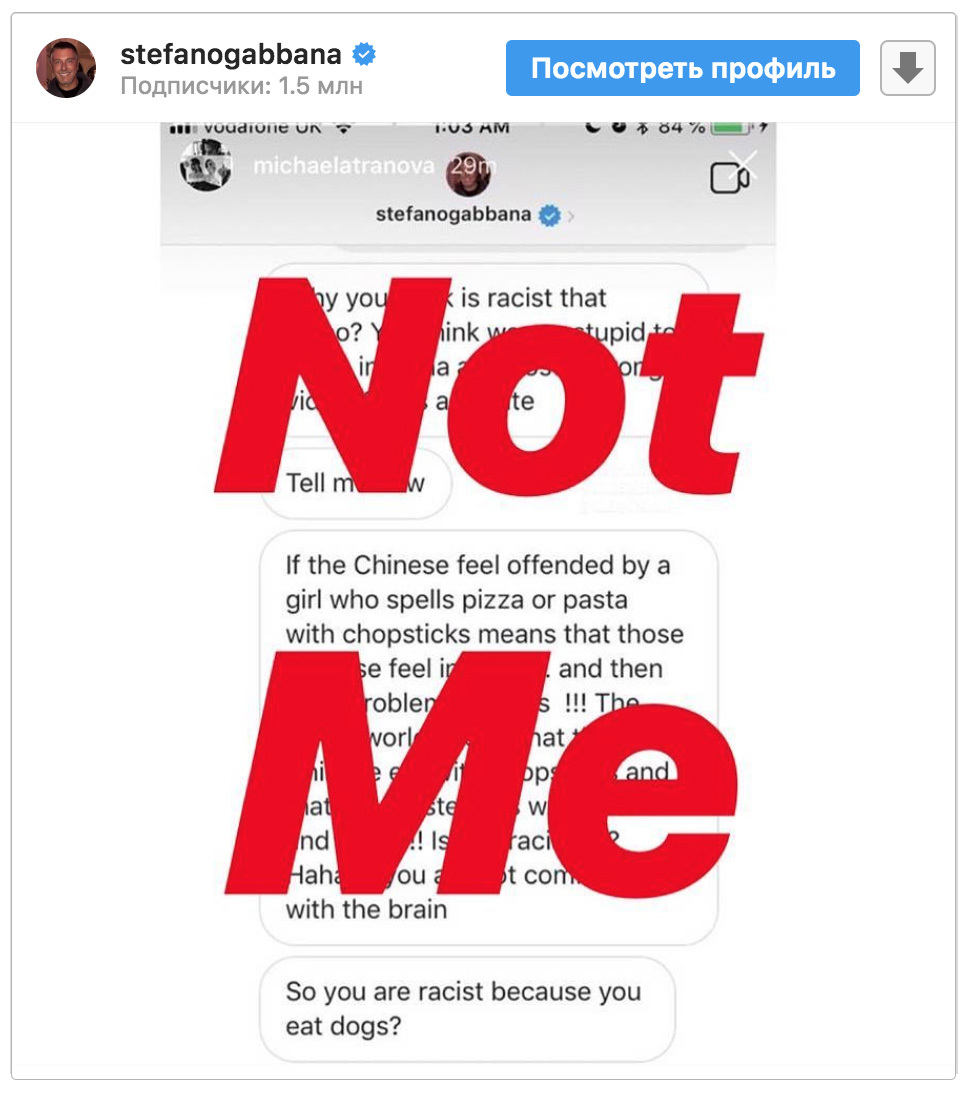 Спорные ролики быстро удалили из аккаунтов марки, но в сеть попали скриншоты личной переписки Стефано Габбаны с одним из подписчиков Diet Prada, который призывал к бойкоту и затегал дизайнера в своей инстаграм-стори. В серии сообщений Габбана назвал сотрудников китайского офиса бренда «тупыми», написал, что лично он никогда не стал бы убирать ролики из соцсетей, охарактеризовал Китай чередой эмодзи-какашек и использовал выражение «грязная тупая дремучая китайская мафия». Позже он попытался объяснить оскорбительные сообщения тем, что его аккаунт взломали. Дизайнер выложил в инстаграм скриншот «взломанной переписки» с большой надписью поверх: «ЭТО НЕ Я». «Мои юристы уже занимаются этим вопросом. Я люблю Китай и китайскую культуру. Мне так жаль, что это случилось», — добавил Габбана в посте.