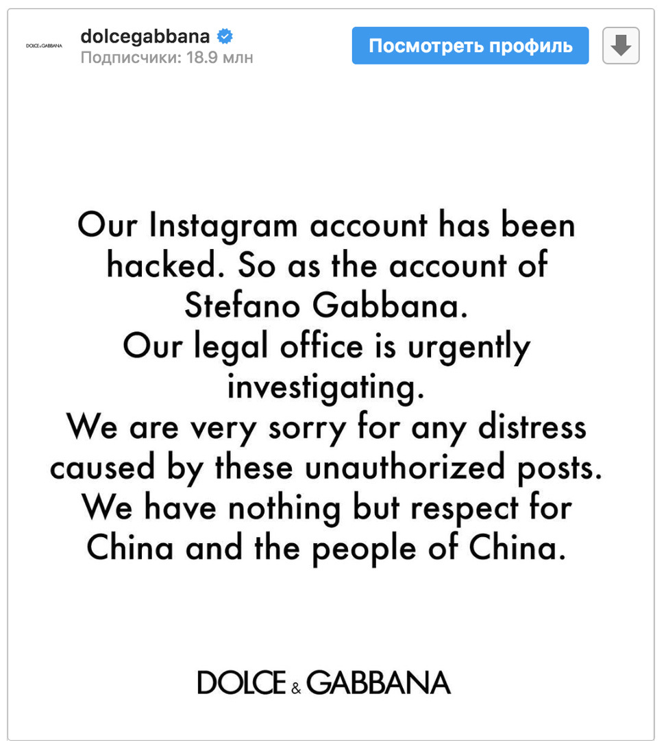 В официальном аккаунте Dolсe & Gabbana тоже появились извинения; марка поддержала версию о хакере. «Нас взломали, как и аккаунт Стефано Габбаны. Мы начали экстренное расследование. Приносим огромные извинения всем, кого задели эти посты, которые не имеют к нам отношения. Мы очень уважаем Китай и всех его жителей», — говорилось в посте.