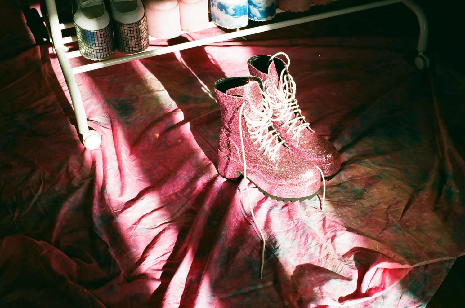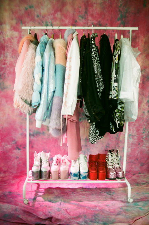 В гостиной-студии стоит рейл с десятком розовых одежд разной степени экстравагантности, рядом с ним — пара кроссовок и массивных ботинок на платформе. Лена поясняет: «Каждый раз, когда я делаю съемку, я подмечаю, какие прически и макияж мне идут, а какие — нет, и я могу это использовать в своих повседневных луках. Однажды для фотосессии мне сделали африканские косички с цветными прядями, и потом я ходила с ними две недели. Также было с веснушками и розовыми румянами — теперь без розовых щечек я вообще не могу выходить из дома. Еще улавливая удачный поворот головы или прищур, я запоминаю его и стараюсь повторить их в реальной жизни. То, что мне всегда не нравится на себе, — это тугие затянутые хвосты и кукольные розовые губы. Это мне точно не идет». К визажистам и парикмахерам на съемках Лена прислушивается редко: «Они воспринимают меня как модель, хотя я в первую очередь фотограф. Чтобы понять, как вести себя в кадре, я сначала училась снимать других людей».