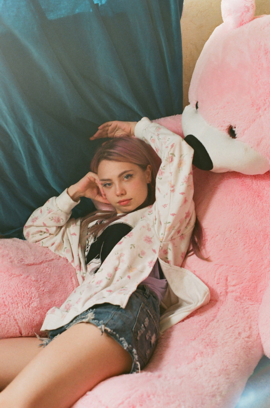 Сидя в позе лотоса на розовом плюшевом диване, Лена проводит экскурсию по квартире, которую они вместе с Женей превратили в студию. Здесь молодые люди снимают фантастические портреты для аккаунта @sheidlina с огромным количеством реквизита, сказочными нарядами и живописным мейкапом. «Моя квартира — это творческое пространство. Мы купили кучу разноцветных фонов, чтобы фотографировать и делать видео, тут же можно и рисовать», — Лена кивает на десять рулонов, лежащих на шкафу, — от ментолового до ярко-розового. «Я не трачу время на дорогу до студий и могу начать снимать сразу, как ко мне пришла идея. Кроме того, это позволяет мне снимать долго, до победного, пока не выйдет так, как я придумала это в своей голове. Откладывать задумку на потом нельзя — нужно как можно скорее найти или смастерить нужные декорации, чтобы не было времени подумать и понять, что это абсолютное сумасшествие», — с воодушевлением продолжает она.