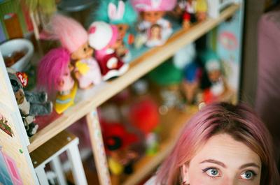 При всей визуальной выразительности готовых снимков жилое пространство не переполнено китчевыми деталями: большая часть реквизита после съемки отправляется на помойку. «Иногда я жалею, что от чего-то приходится избавляться, но второй раз использовать те же предметы я не хочу». Из того, что осталось, — большое неоновое панно над диваном. Решетка из зеленых, оранжевых и сиреневых светящихся трубок была сделана специально для фотографии, на которой Лена изображала полицейского, а фоном был как раз этот символ заточения. Кислотный свет от лампы падает на коллекцию троллей Лены: разновозрастные персонажи с цветными волосами расставлены в многоэтажном кукольном домике. Собирательство началось с пяти троллей, найденных на Уделке, «Авито» и eBay, а в один из дней рождения в одночасье к ним присоединились еще сорок, подаренных Женей. «Я полюбила этих существ еще в детстве, когда моя бабушка купила мне одного, несмотря на то, что мама запрещала ей это. Они некрасивые, но необычные, экспрессивные — прямо как я!» Другой яркий акцент на фоне бежево-кофейного евроремонта — огромный розовый медведь. Игрушка размером с саму Лену — тоже подарок Жени, ждет своего часа для съемки: по задумке он вместе с Леной будет сбегать из тюрьмы, но не сможет выбраться, застряв в ограде.
