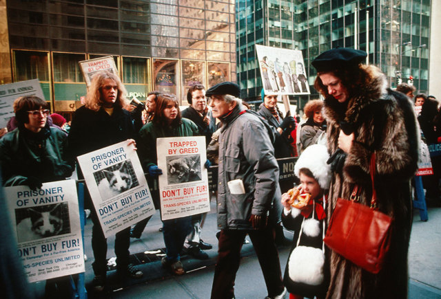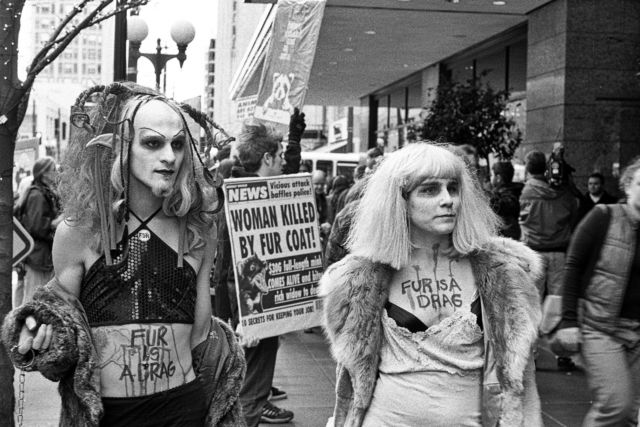 протест Fur Free Friday, 1999. Проводится ежегодно в черную пятницу в магазине NORDSTROM, сиэтл, организацией по защите прав животных Northwest Animal Rights Network