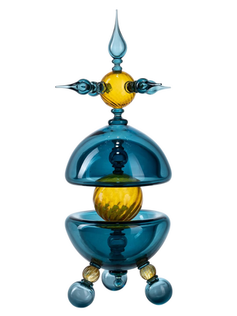 Кристина Краснянская: «В галерее Heritage идет выставка современного художественного стекла “Орбиты хрупких тел”, посвященная космосу как образу бесконечности. Можно взять оттуда вот такую симпатичную работу петербургского художника Макара Жемчужникова, напоминающую легендарную Memphis Group, основанную уже упомянутым Этторе Соттсассом».