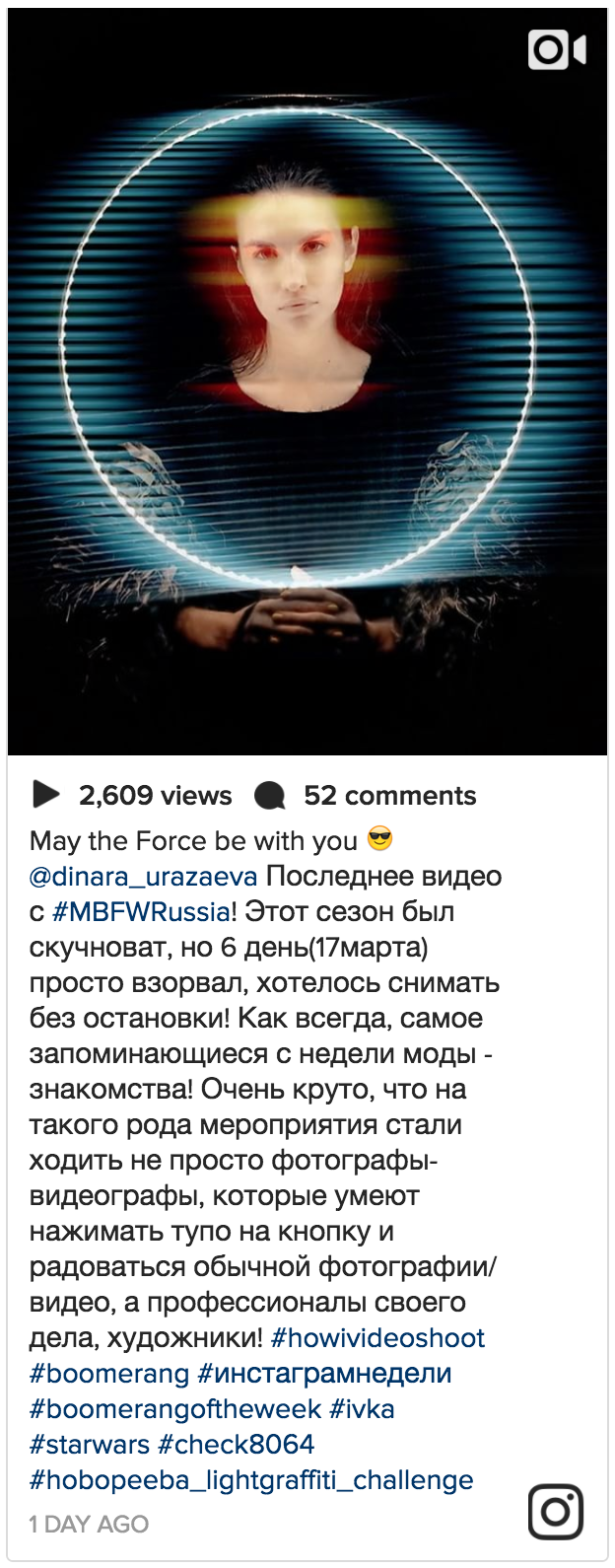 May the Force be with you ? @dinara_urazaeva Последнее видео с #MBFWRussia! Этот сезон был скучноват, но 6 день(17марта) просто взорвал, хотелось снимать без остановки! Как всегда, самое запоминающиеся с недели моды - знакомства! Очень круто, что на такого рода мероприятия стали ходить не просто фотографы-видеографы, которые умеют нажимать тупо на кнопку и радоваться обычной фотографии/видео, а профессионалы своего дела, художники! #howivideoshoot #boomerang #инстаграмнедели #boomerangoftheweek #ivka #starwars #check8064 #hobopeeba_lightgraffiti_challenge