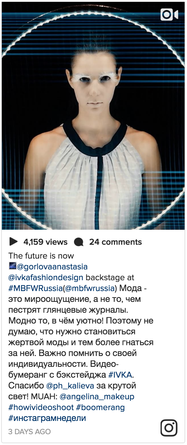 The future is now ?@gorlovaanastasia @ivkafashiondesign backstage at #MBFWRussia(@mbfwrussia) Мода - это мироощущение, а не то, чем пестрят глянцевые журналы. Модно то, в чём уютно! Поэтому не думаю, что нужно становиться жертвой моды и тем более гнаться за ней. Важно помнить о своей индивидуальности. Видео-бумеранг с бэкстейджа #IVKA. Спасибо @ph_kalieva за крутой свет! MUAH: @angelina_makeup #howivideoshoot #boomerang #инстаграмнедели